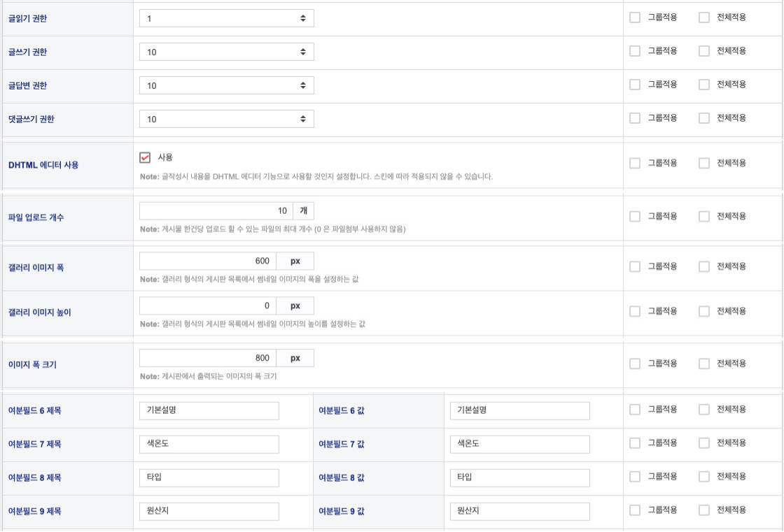 • 게시판 추가 설정(관리자 - 테마설정관리 - 게시판 추가설정)