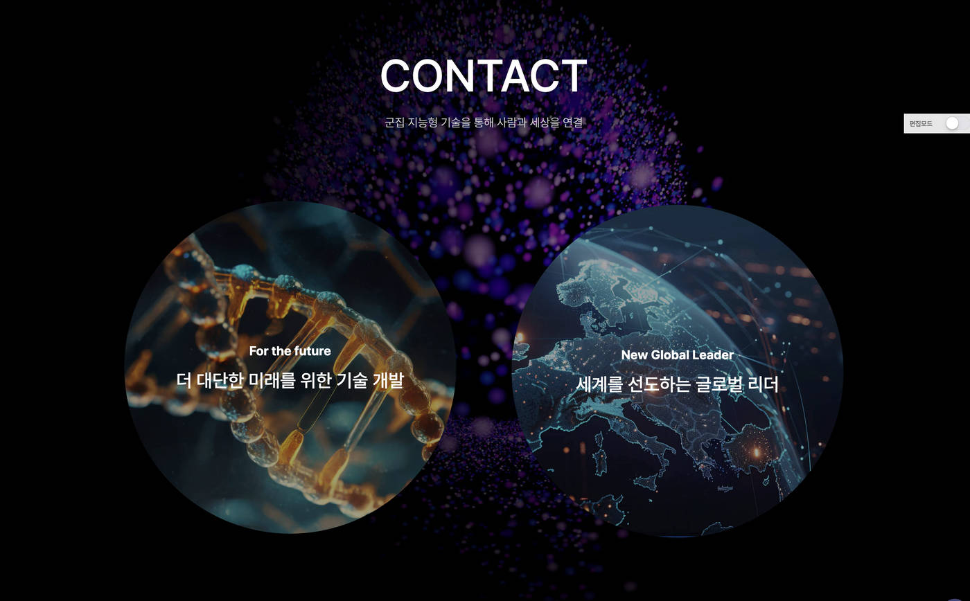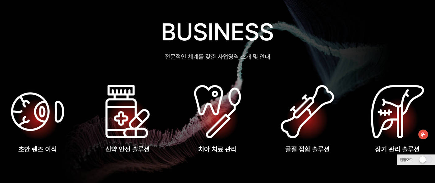 편집 모드를 통해 로고, 메뉴, 회사정보 입력은 물론 사이트 콘텐츠의 이미지와 텍스트를 보여지는 화면에서 바로 수정이 가능합니다.